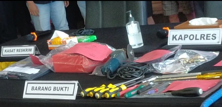 Polisi berhasil menyita barang bukti kejahatan dari pelaku, 6 buah obeng besar, 2 buah obeng kecil, 1 buah kunci L, 1 buah tang, 1 buah mesin gerinda, 1 linggis, 1 kotak perhiasan, 1 brangkas, 7 unit Handphone dan TV 43 inci.